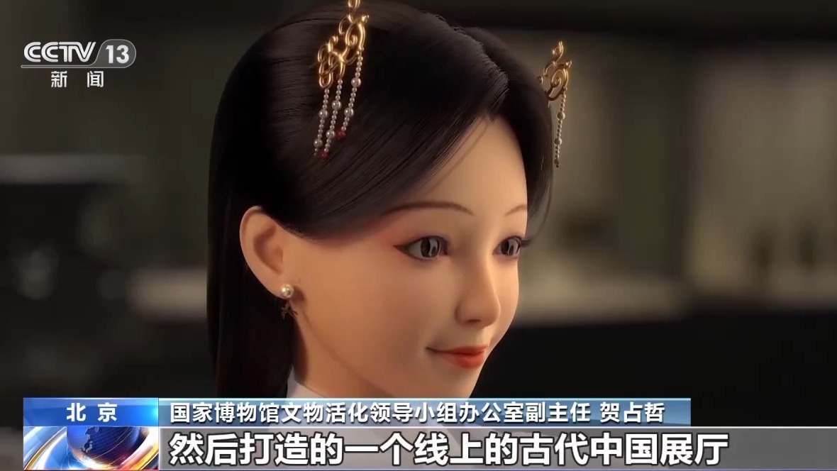 国家博物馆文物活化领导小组办公室副主任 贺占哲:中华文明云展其实就是以我们的古代中国为基础,打造的一个线上的古代中国展厅。这个展厅人特别多,我们希望更多的人在家里就可以直观地看这个展厅的形象,所以我们引入数智人去带着大家参观,这样的话跟大家更有亲近感。